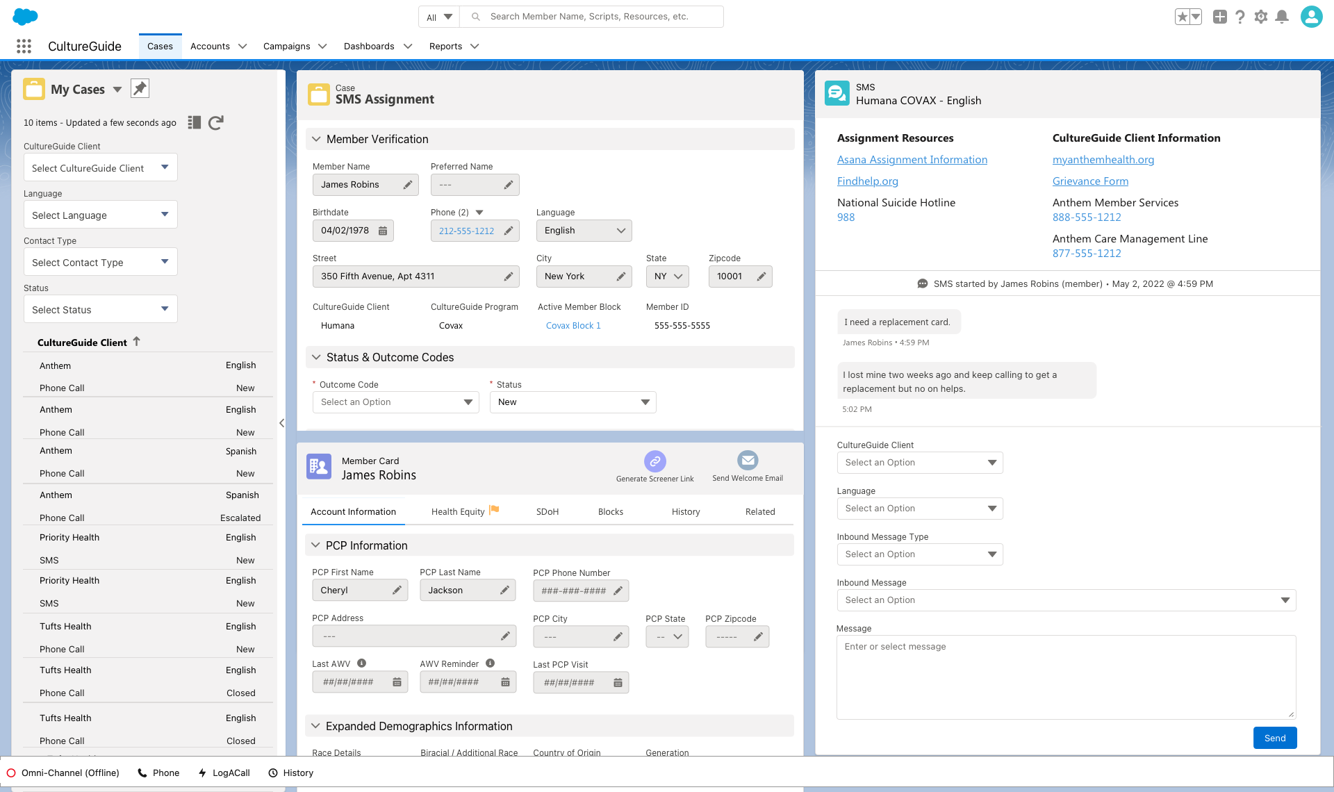 CultureGuide, SameSky Health’s (acquired by GroundGame Health) culturally intelligent engagement solution, empowers health plans to connect members to services regardless of cultural background. The platform had been migrated to Salesforce and built before a Product Design team existed. After launch, Community Health Guides (CHGs) using the platform experienced significant usability challenges. The clinical operations team requested design review and optimization recommendations. Initial heuristic evaluation revealed sorting/filtering failures, inconsistent information updating, component duplication, and naming conventions that didn’t match real-world usage.