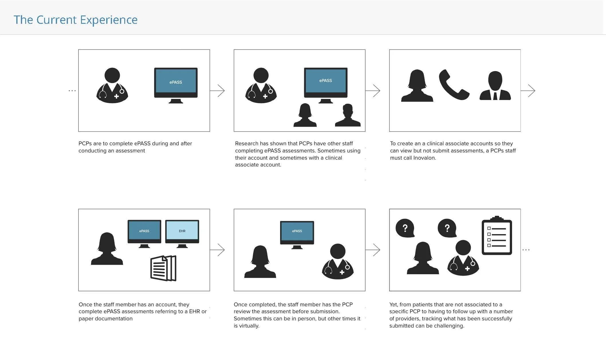 Inovalon’s ePASS clinical assessment tool had operated for over with a great amount of success as one of Inovalon’s flagship products and consistent revenue generator. The Its success notwithstanding, the Product team had fundamental misunderstandings about its users. The product team assumed doctors and clinicians were independently completing SOAP note assessments, but completion rates remained stagnant, directly impacting revenue streams for Inovalon, health plan clients, and provider cash incentives. In reality, while clinicians signed off on assessments as legally required, support staff performed the majority of data entry work. Some health plan clients were even hiring dedicated support staff specifically to complete ePASS assessments across provider offices. The scale varied dramatically - from supporting 5 doctors in one office to managing 400 offices and thousands of doctors.